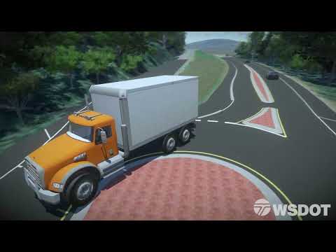 This is an animation of a large tractor-trailer making a left turn through a roundabout.